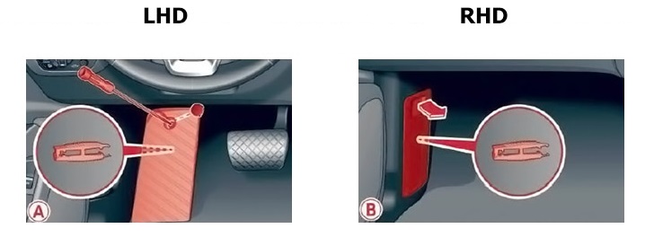 Veicoli con volante sul lato sinistro: Si trova sotto il poggiapiedi.