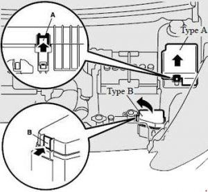 Mitsubish Mirage – Schema della scatola dei fusibili – vano motore – ubicazione