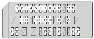 Fusibile dell’accendino (presa) in Toyota Auris Hybrid (2011-2012). Il fusibile 2 e 27 si trovano nella scatola dei fusibili del quadro strumenti.